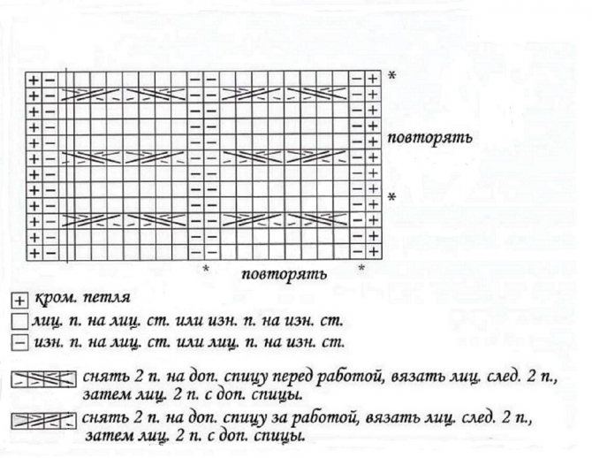- снимаем 2п. на доп. сп. за работой, 2л., провязываем 2п. с доп. спицы лицевыми.