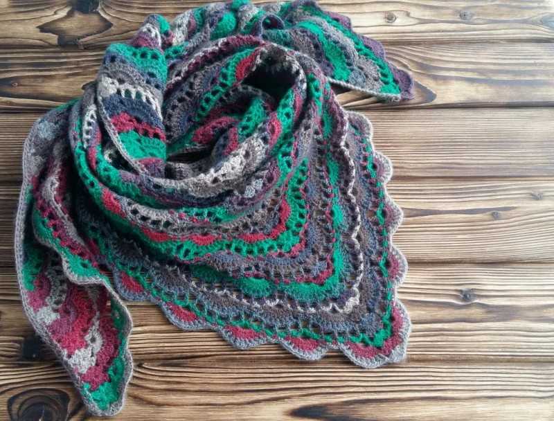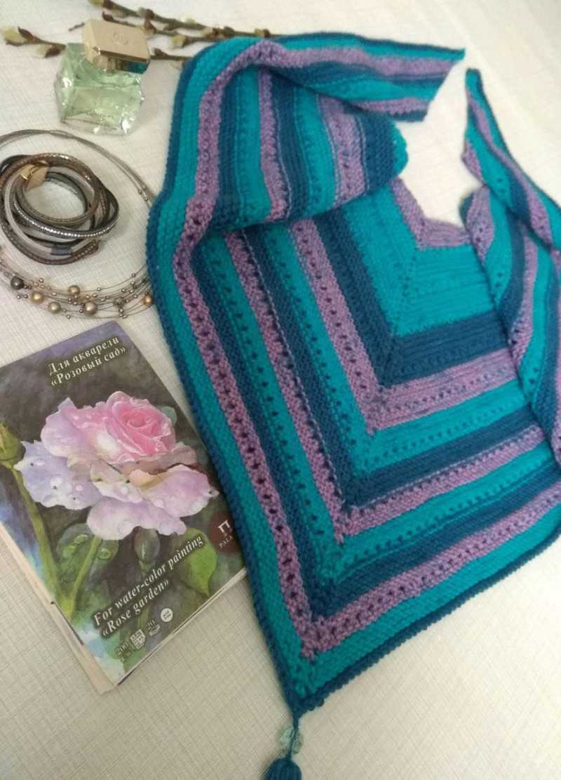 Этот вид вязания сложнее. Форма остается треугольной, но треугольник получается разносторонним. Длинные концы получаются разными по длине, от этого внешний облик только выигрывает.