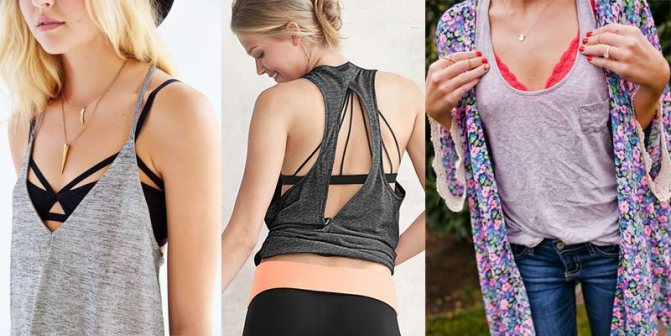 Для спортивных девушек кружево в одежде – практически табу. Поэтому они выбирают топы с перекрестом лямок в верхней части и носят либо под свитера и рубахи свободной посадки, либо просто так, когда жарко.