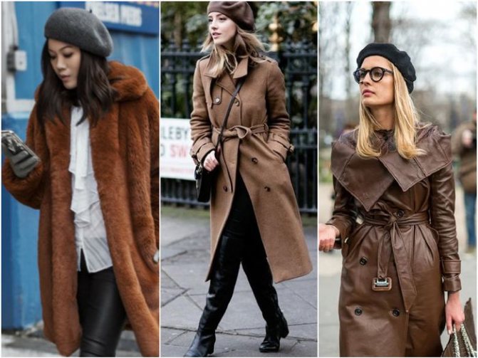 Со стильными тренчами оттенка черного шоколада, бронзы или кофе с молоком хорошо сочетаются любые головные уборы – молодежные вязаные шапочки, кепки, береты, гламурные шляпы с широкими полями. Из цветов доминируют черный, белый, молочный, бежевый и различные оттенки коричневого.