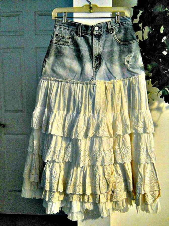 Итак, необходимо отрезать верх от детских джинс, чтобы получилась кокетка. Задние карманы, если они есть — лучше не трогать. Как бы аккуратно вы их не отпороли — следы останутся. Из оставшихся штанин будем делать волан. Вырезаем длинные полоски ткани. Волан получится, если стачать несколько полосок поперёк. Ширина волана может быть от 9 до 12 см. Длина — обхват талии умножить на 2. Стачиваем швы на оборке, обрабатываем срезы, чтобы не высыпались и разутюживаем их. Далее — обрабатываем низ волана. Шьём сюда тонкое кружево (кто умеет вязать крючком — есть много вариантов узоров), можно обработать них любой атласной лентой, или выкроить бейку по косой из любой ткани.
