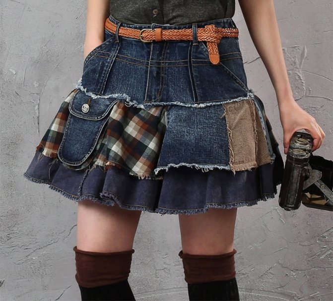 Древнейшая техника рукоделия печворк, с использованием различных отрезов ткани, позволяет юбке из джинс стать лучшей деталью гардероба. Сложность состоит в количестве требуемого материала.