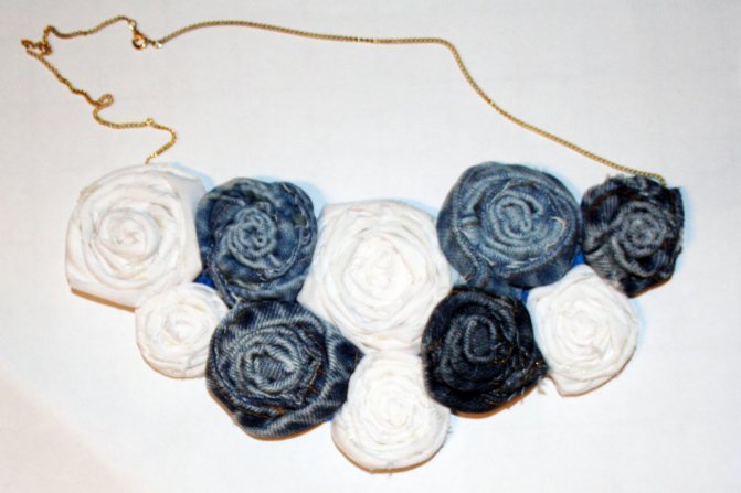 Нарежьте оставшиеся части джинсов на полосы не более 10 см шириной. Сшейте их в 2 ленты. Ленты разрежьте на трапеции. Снова сшейте. Готовую полоску пришейте к кокетке по спирали.