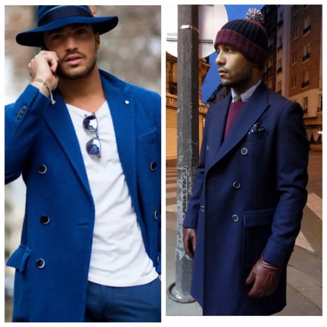 Многие мужчины предпочитают носить синее пальто с контрастным или однотонным головным убором.