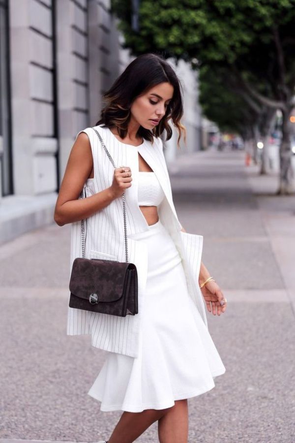 Гулять в очень коротком топе как-то не слишком прилично. Но добавьте к нему изящную юбку-годе и удлиненный жилет без рукавов и образ получится оригинальным и сдержанным.