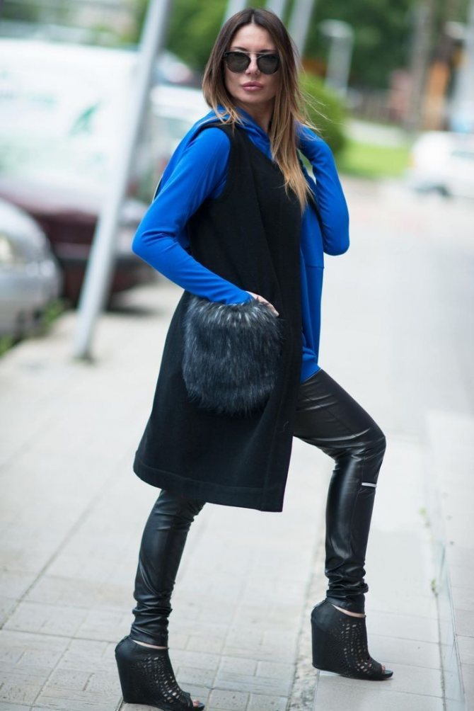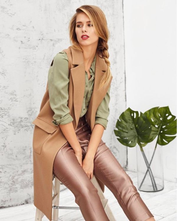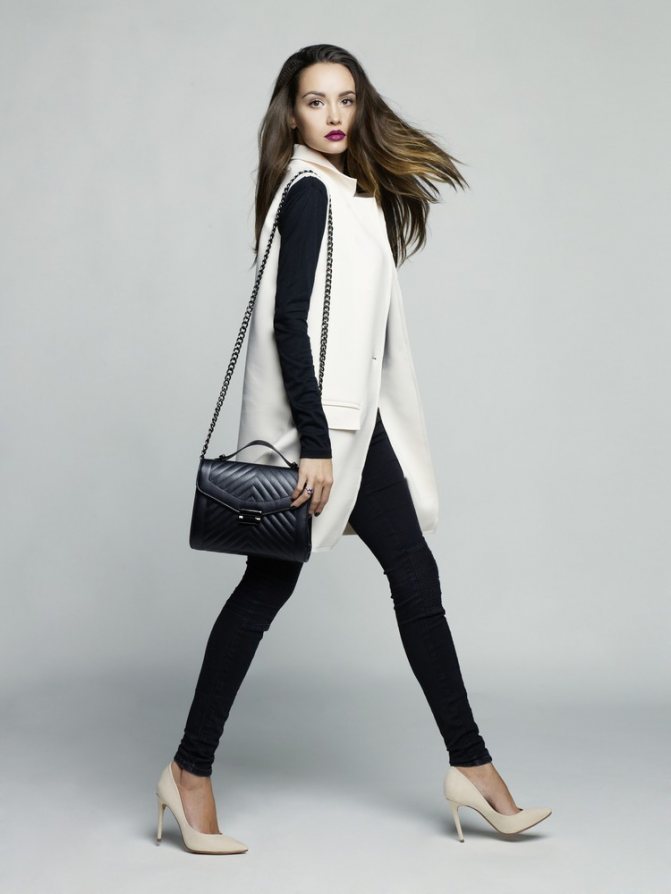 В моду вернулись обтягивающие лосины и скинни. Создать привлекательный и стильный образ помогут высокие каблуки и удлинённый жилет без рукавов.