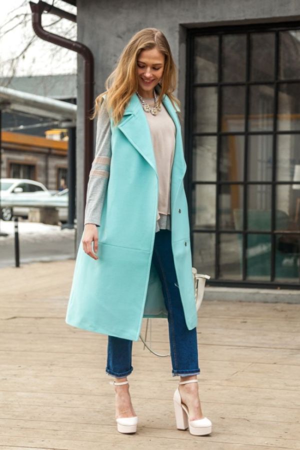 Весной как никогда хочется выглядеть красиво и женственно. Противоречить такому желанию – это настоящее преступление, поэтому мы призываем вам обзавестись самым что ни на есть весенним жилетом небесного оттенка и составлять с ним романтичные образы. Как вариант – это сочетание светлой летящей блузы с джинсами и белыми босоножками.