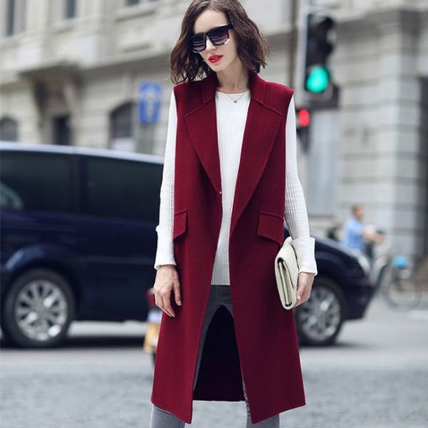 Самый актуальный вариант удлиненного жакета – изделие без рукавов, длиной чуть ниже колена, лаконичным силуэтом и отсутствие декора. Благодаря прямому покрою подходит для большинства типов фигур, делает ее более вытянутой, стройной, особенно, если носить жилет расстегнутым. Стоит помнить, что помимо вытянутости силуэта, он зрительно укорачивает ноги, поэтому есть некоторые моменты, которые нужно учитывать обладательницам невысокого роста, фигур типа груша, песочные часы.