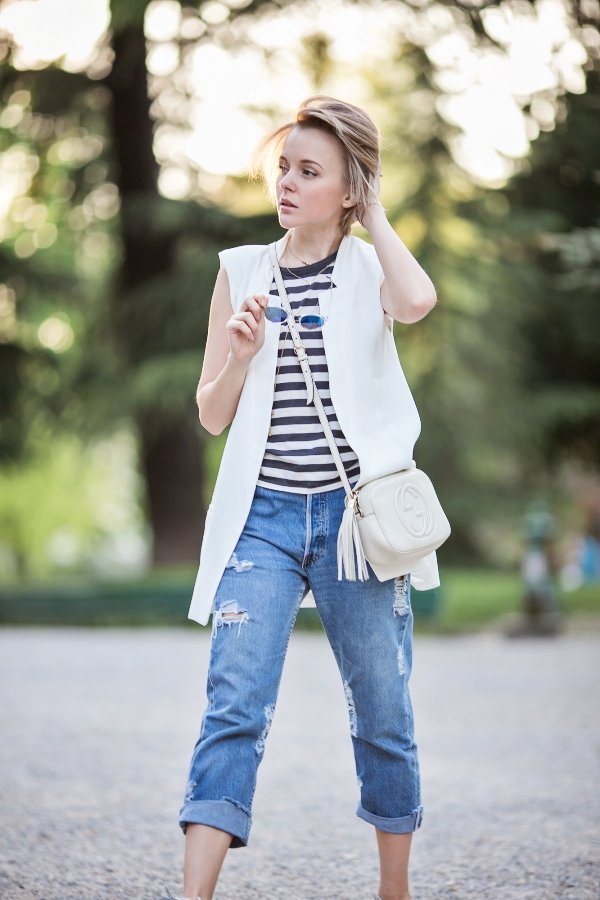 Это фото подскажет, с чем носить удлиненный жилет молодым девушкам, которые любят дерзкий стиль в одежде. Наверняка рваные джинсы – это заядлый любимчик в их гардеробе. Чтобы разнообразить будничные луки, можно попробовать надеть их с полосатой футболкой и белой жилеткой. Альтернативный вариант верха – это укороченная водолазка и темный жакет. Очень свежо и стильно!