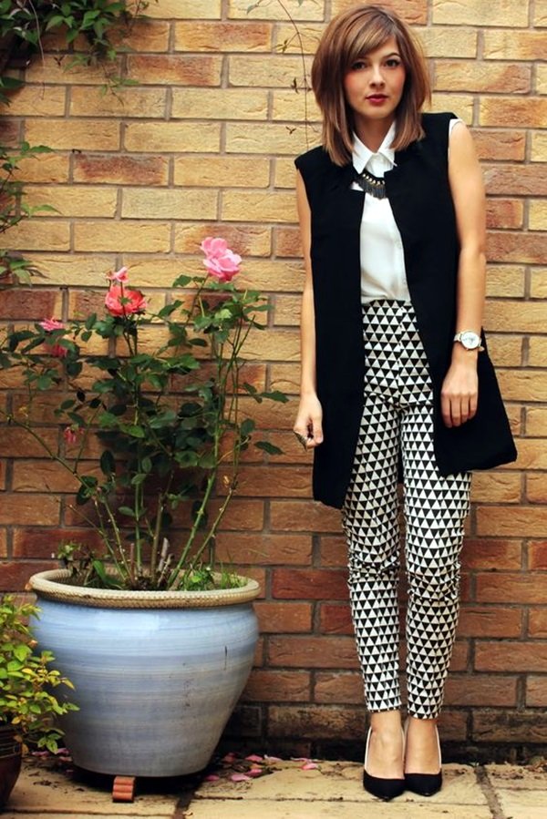 Предлагаем использовать это фото как мастер-класс о том, какой образ можно создать с модными брюками с геометрическим принтом. Чтобы уравновесить креативность низа, советуем подбирать к нему белую рубашку и черный жилет. Не стоит игнорировать аксессуары в повседневности – например, колье и стильные часы могут стать лучшим завершением лука.