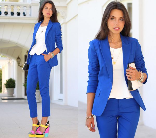 Для создания стильного полустрогого образа, который подойдет и для работы и для прогулки советуем примерить синий тотал-лук, т.е. вместе с брюками цвета виолы (или менее яркого цвета) следует надеть синюю рубашку или блузку (вполне уместен цветочный принт), накинув сверху синий пиджак. Не бойтесь обилия одного цвета, аксессуары и сумка тоже могут быть blue. Только туфли лучше выбрать черные лакированные. Более классический вариант — это конечно же белая, черная, кремовая блузка.