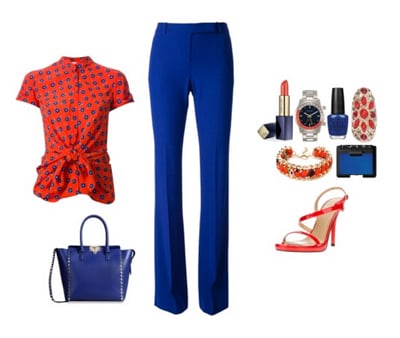 Синий низ весьма дружелюбен к различным вариантам яркого верха. Например, вы можете взять на заметку эффектное и сочное сочетание с красным, которое великолепно подходит для выхода в свет. Оптимальная модель брюк в таком случае – это роскошные клеш, а лучший выбор аксессуаров – массивное колье и клатч под цвет низа.