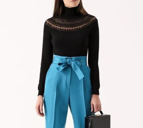 Завышенная талия в сочетании со стрелками – это интересный отголосок ретро, который уверенно возвращается в современную моду в качестве отдельного представителя. За счет уникальности цвета и фасона низа, верх к такому луку надо подбирать более нейтральный. Как насчет лаконичной водолазки черного или белого цвета?