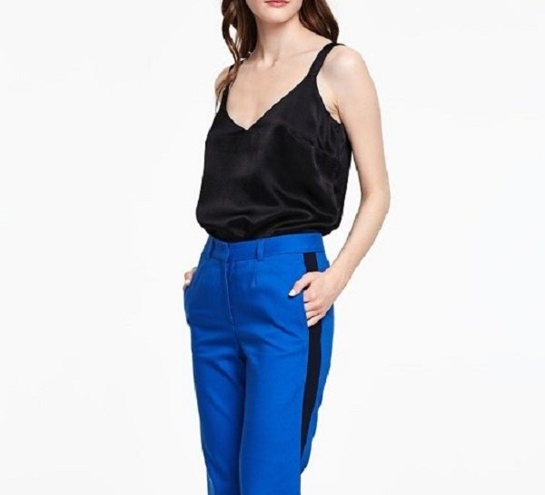 Синие брюки с лампасами прекрасно сочетаются с элегантным верхом вроде шелкового топа или рубашки и создают особенный образ для важного повода.