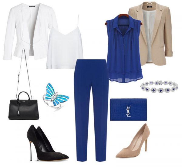 Цвету сапфира благоволят многие дизайнеры женской одежды. Такой оттенок выглядит благородно и насыщенно. Темно-синие брюки прямого кроя незаменимы в образе бизнес-леди. Цвет добавляет образу строгости и импозантности.