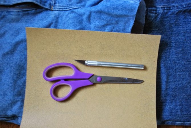 Картон вкладываем в штанину и делаем разрез на ткани. Несколько ниток вытягиваем, а края выреза обрабатываем щеткой для ног.