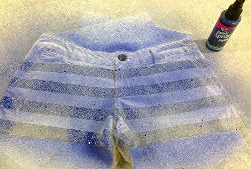 Затем красим шорты краской в спрее или наносим специальной губкой, если она в банке. Проделываем это по очереди с двух сторон.