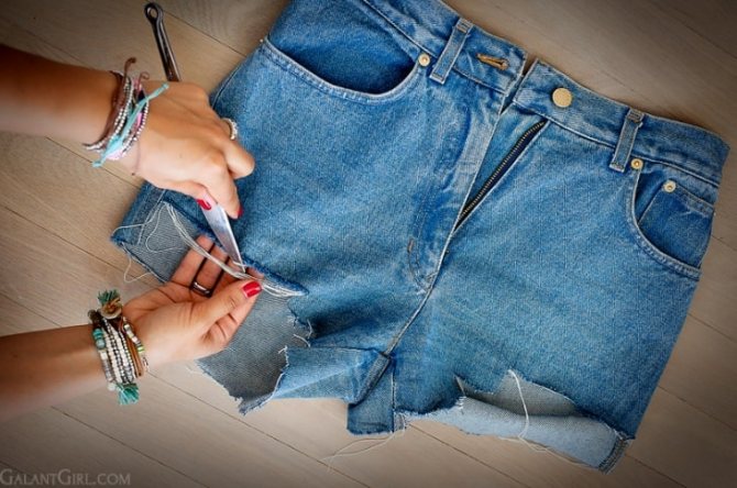 Если вам нравятся потертости, то в нижней части шорт ножницами вынимайте белые нитки.