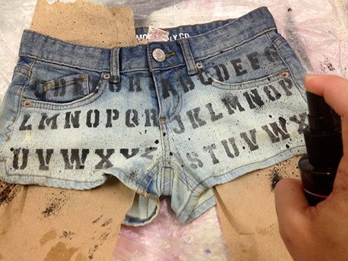 Снимаем трафарет очень осторожно, чтобы не испачкать краской шорты. И приступаем к покраске другой части.