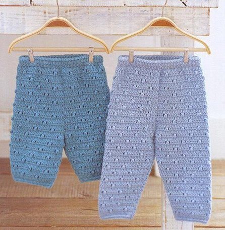 Примечание: По этой же выкройке можно связать крючком или спицами отличные «джинсы» для ребенка. Готовое изделие нужно будет дополнительно декорировать вязаными карманами на задней части брючек и вышитыми «строчками» из ниток контрастного оттенка. Такая модель выглядит очень оригинально и актуально, малыш точно не останется незамеченным. Штаны подойдут и на прогулку, и для посещения поликлиники или развивающих занятий.