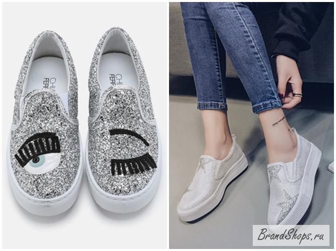 Яркие и блестящие слипоны подойдут для вечернего образа.