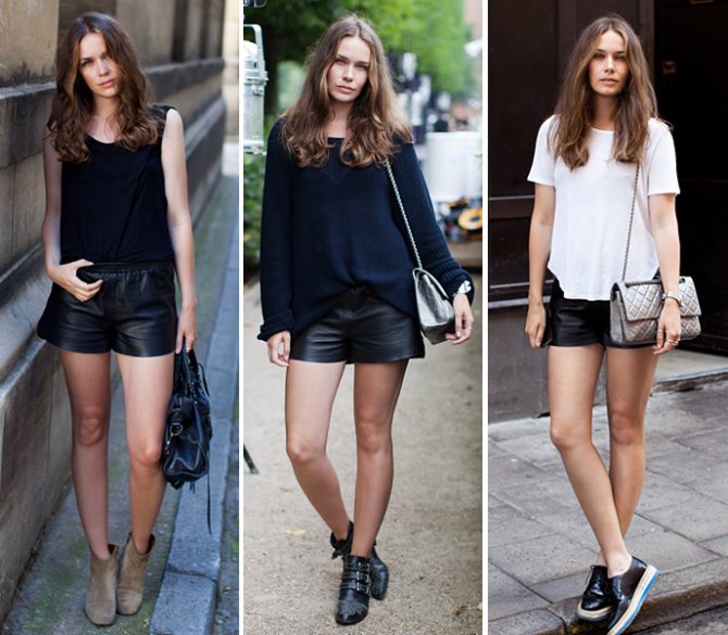 Лук с черными шортами, изготовленными из натуральной или искусственной кожи, выглядит очень смело, дерзко и экстравагантно. Позволить себе надеть эту вещицу может далеко не каждая барышня, хотя в действительности, с ней можно создать огромное множество интересных outfit’ов. Так, она великолепно сочетается с белоснежными блузами и рубашками, ультракороткими кроп-топами и удлиненными туниками, спереди заправленными вовнутрь.