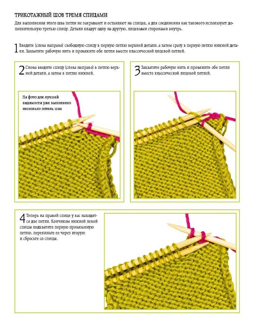 Складываем плечи изделия лицом вовнутрь. Для этого мы переносим на 3 спицы 25 и 25 п. правой полочки (на 1 спице должны быть только лиц. п, на 2-ой – только изнаночные), соединяем, либо при помощи иглы и нити, либо 3-ей спицы связываем трикотажным швом: