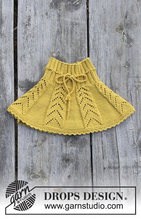 Размеры юбки в складку: 2 – 3/4 – 5/6 – 7/8 – 9/10 -11/12 лет. Размер в см: 92 – 98/104-110/116-122/128-134/140-146/152 Пряжа DROPS MERINO EXTRA FINE (шерсть; 50гр=105м) по 3-3-4-4-4-5 мотков, № 30 mustard Круговые спицы 4 мм (60см) и 3.5 мм (40см) Крючок 3.5 мм. Плотность: 10 х 10 см = 21 пт и 28 рд лиц. гладью спицами 4 мм 10 х 10 см = 22пт и 30 рд спицами 3 5 мм.